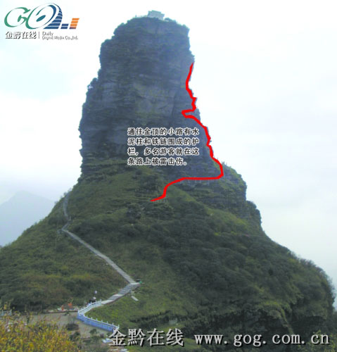 據(jù)劉先生介紹,當(dāng)天在下雨,上午他們一行8人坐索道到了山上后,就分成了兩組。劉先生等6人從剛修通不久的木棧道去蘑菇石景區(qū)游覽,而同行的賴先生則與另一伙伴去攀登金頂。